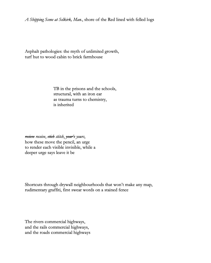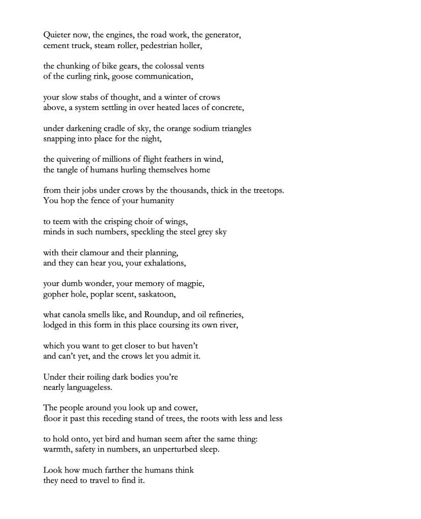 The first excerpt, “Banner, King Street, North Battleford…” was previously published in Arc. “Quieter now, the engines…” was published in Vallum. “The longing, the lively, the study…” was published in the LRC. These excerpts are from Graham’s forthcoming book currently titled Fast Commute.